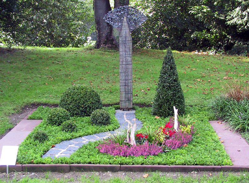 Grabbepflanzung Rahmenbepflanzung*: Buxus sempervirens arborescens (Buchsbaum im geschnittener Form)Flächenbepflanzung*: Buxus sempervirens ‘Herrenhauser’ (Buchsbaum) Weg: gebrochener Basalt - Pflaster Wechselbepflanzung: Calluna vulgaris ‘Roswitha’ (Heide)